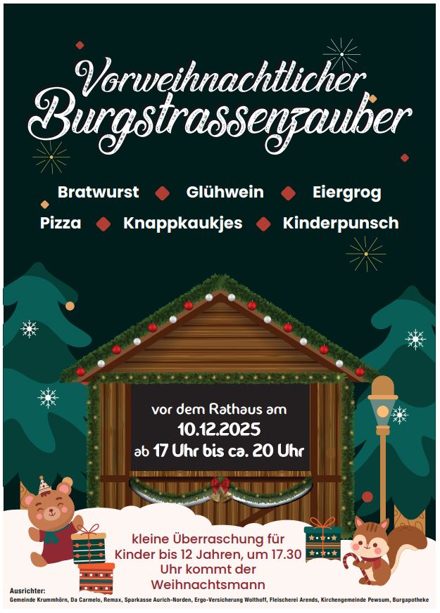 Am Mittwoch, den 10. Dezember 2025, findet erneut der beliebte Vorweihnachtliche Burgstraßenzauber statt. Von 17:00 bis 20:00 Uhr erwartet die Besucherinnen und Besucher ein stimmungsvolles Miteinander im Herzen Pewsums.