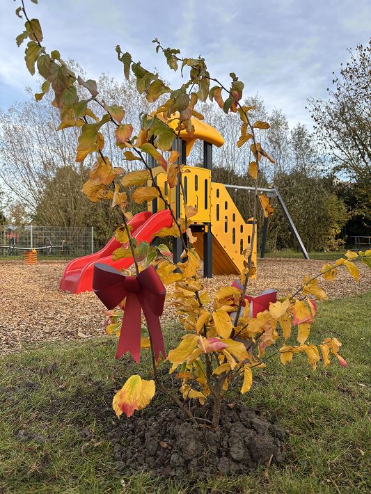 Als Präsent der Gemeinde Krummhörn wurde ein Eisenholzbaum übergeben, der vor Ort von den Mitarbeitern des Bauhofes eingepflanzt wurde. Dieser Baum soll zukünftig den spielenden Kindern Schatten spenden.