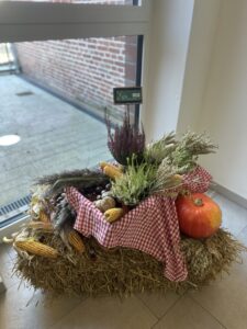 Eine frisch gebundene Erntekrone ziert seit Kurzem den Eingangsbereich des Rathauses in Pewsum.
