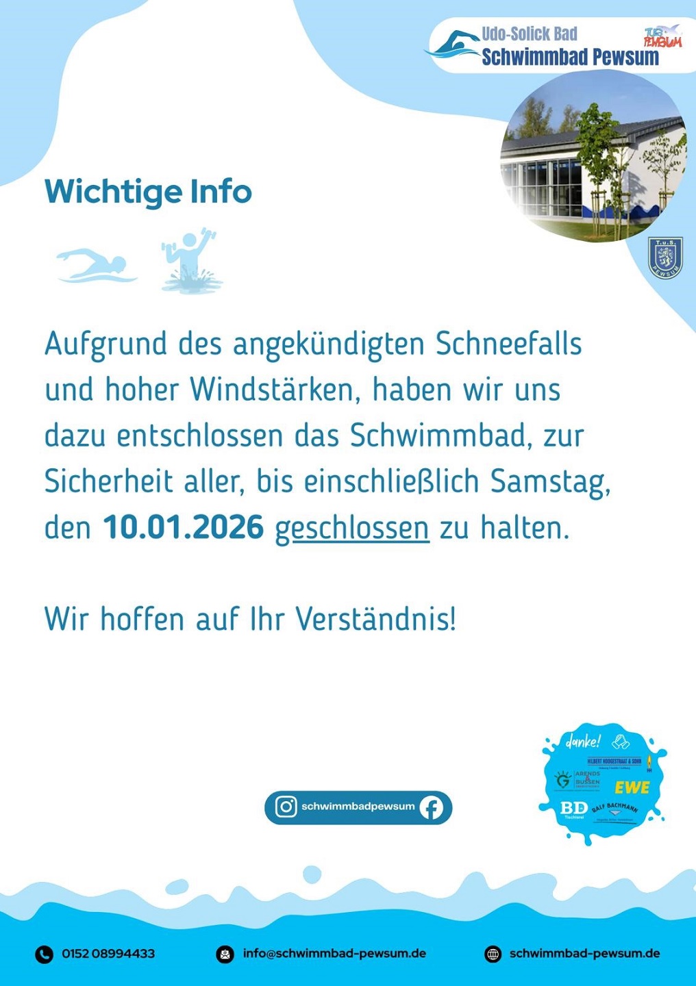 Aufgrund des angekündigten Schneefalls und hoher Windstärken bleibt das Udo-Solick Bad in Pewsum bis einschließlich Samstag, den 10.01.2026 geschlossen.