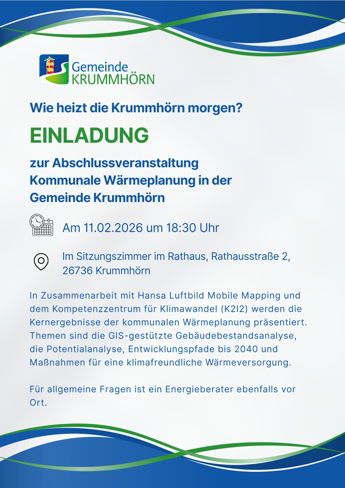 Am Mittwoch, den 11.02.2026 findet um 18:30 Uhr im Sitzungszimmer im Rathaus eine Abschlussveranstaltung zur kommunalen Wärmeplanung in der Gemeinde Krummhörn statt.