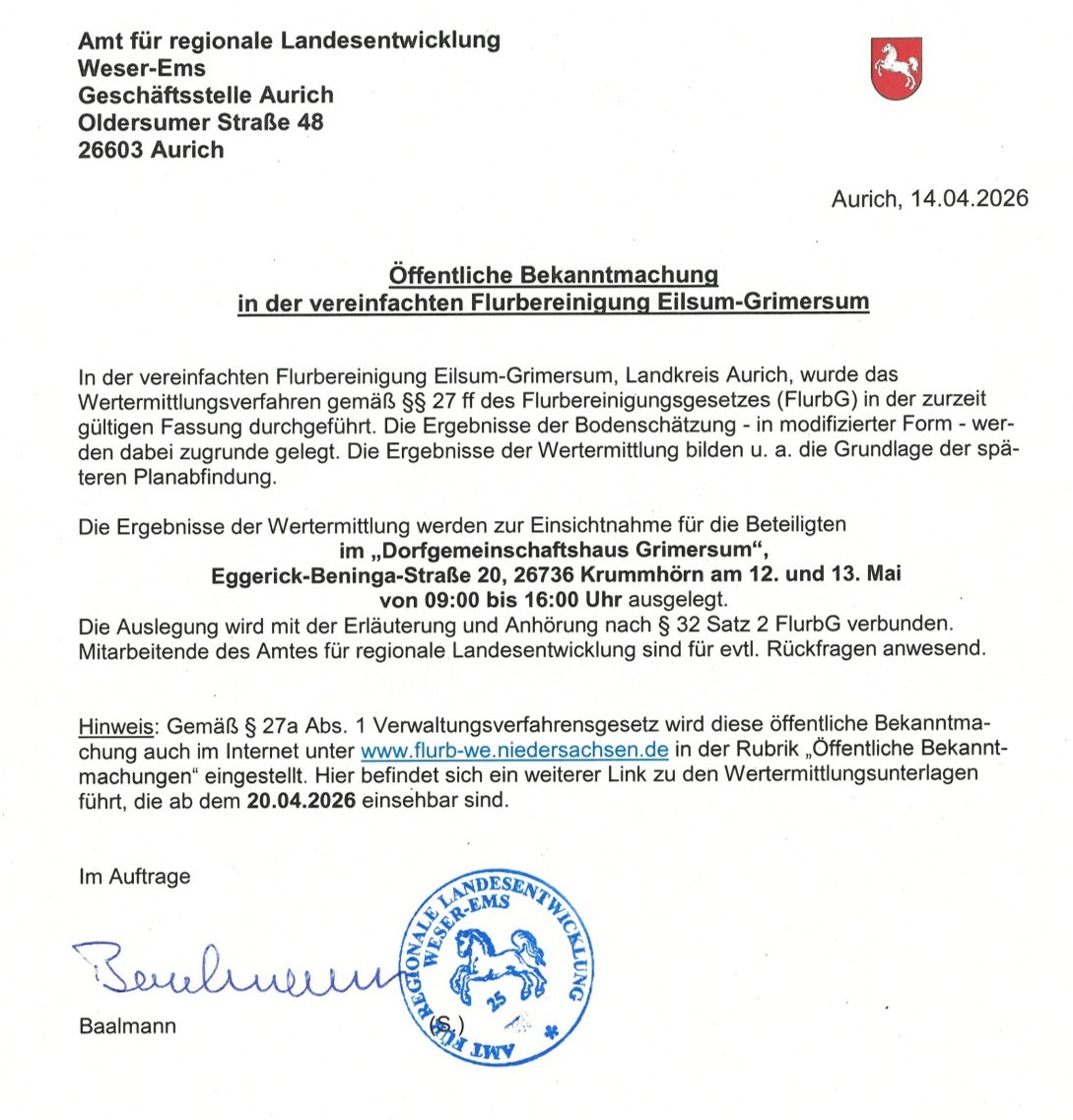 Die Ergebnisse der Wertermittlung werden zur Einsichtnahme für die Beteiligten im „Dorfgemeinschaftshaus Grimersum“, Eggerick-Beninga-Straße 20, 26736 Krummhörn am 12. und 13. Mai von 09:00 bis 16:00 Uhr ausgelegt.